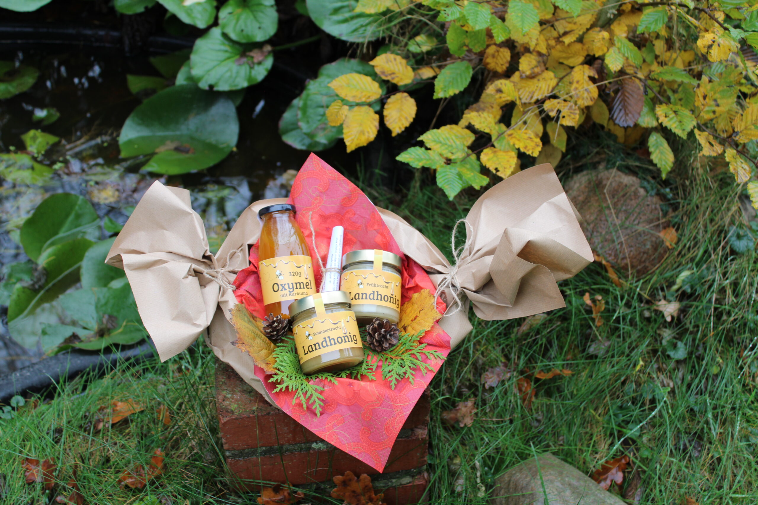 Geschenkkorb „Honig“ enthält in liebevoller, nachhaltiger Verpackung zwei verschiedene Sorten von unserem Honig. Je ein 250g Glas Frühtracht und ein 250g Glas Sommertracht. Zudem unser hausgemachtes Oxymel in der 320g Flasche Sorte Kurkuma.