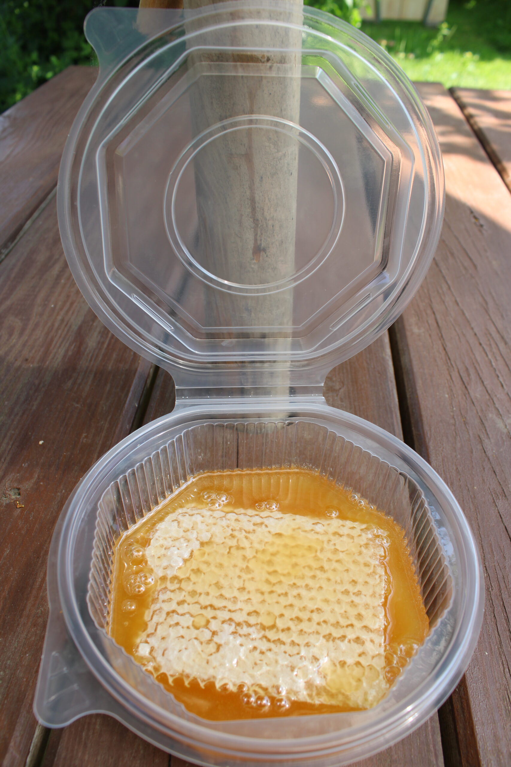 Ein reines Naturprodukt aus dem Kreis Minden-Lübbecke. Ein Stück Honigwabe mit etwas reifem Honig. Das machen wir so, um den natürlichen Charakter des Wabenhonigs zu erhalten. So entsteht eine harmonische Einheit. Eine ganz besondere Spezialität.